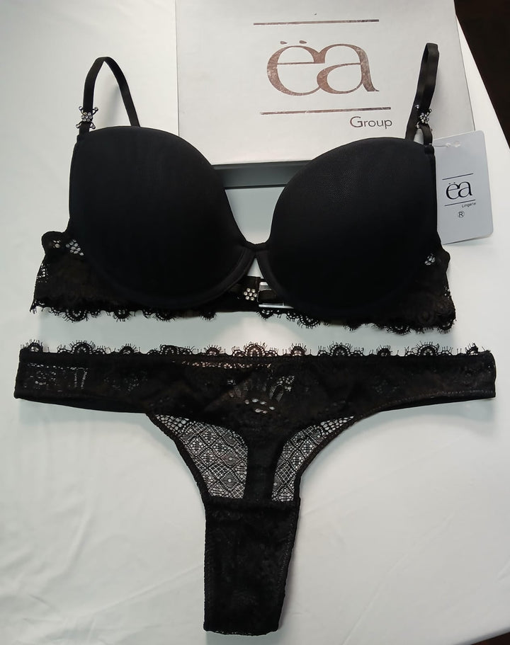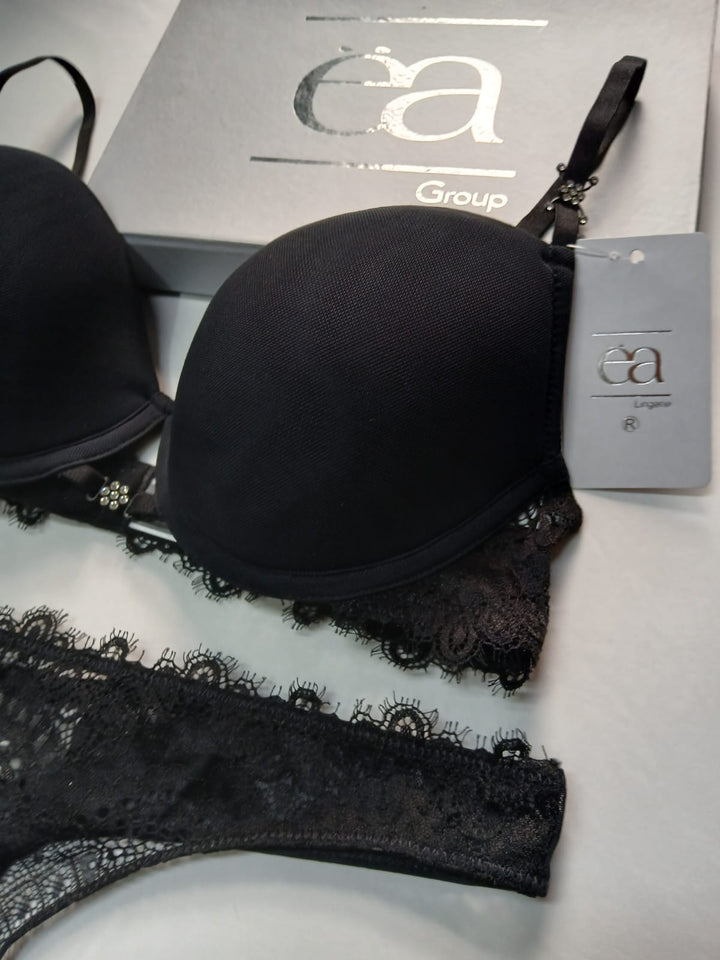 Conjunto de ropa interior; en color negro, brasier sin almohadilla pero con estructura, encaje es contorno y accesorios decorativos en pedrería pequeños; ubicados en el centro del escote y en la cargadera la cual es graduable .